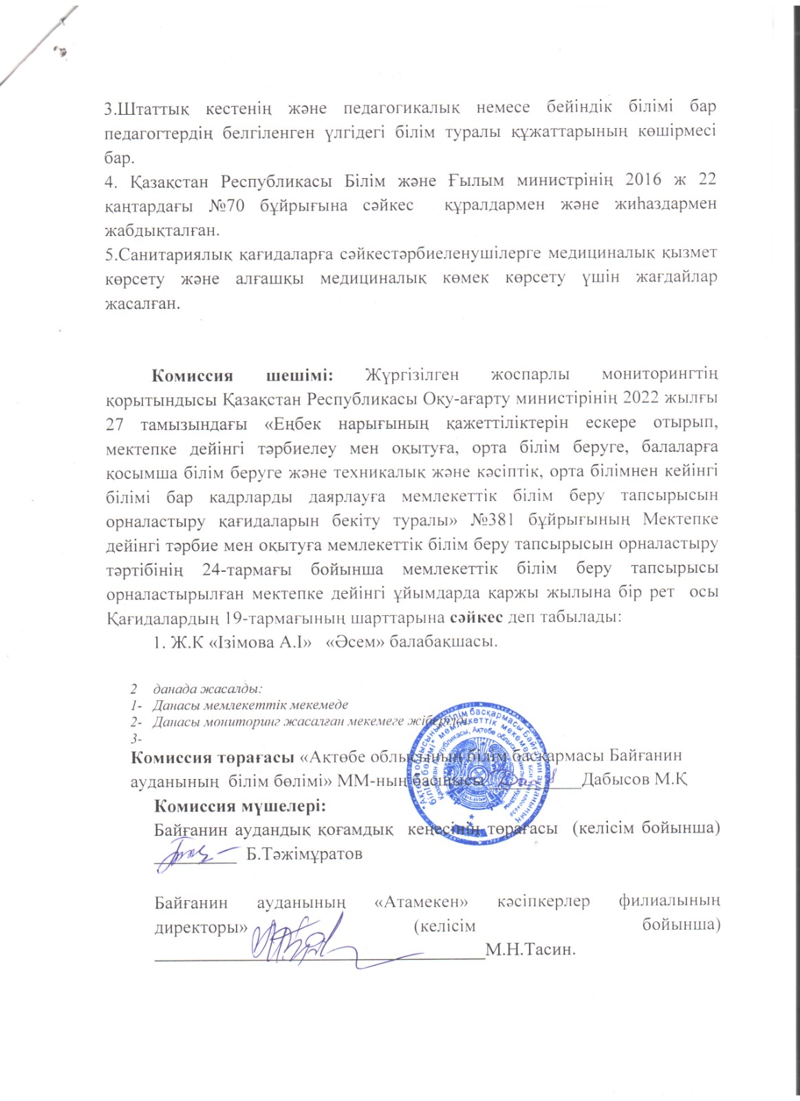 - Байғанин ауданының білім бөлімінің басшысы М.Дабысовтың төрағалық етуімен мемлекеттік тапсырыс алу үшін құжат тапсырған мектепке дейінгі ұйымдардың құжаттары тағы бір мәрте қаралды. Мониторинг қорытындысы туралы акт жасалды.