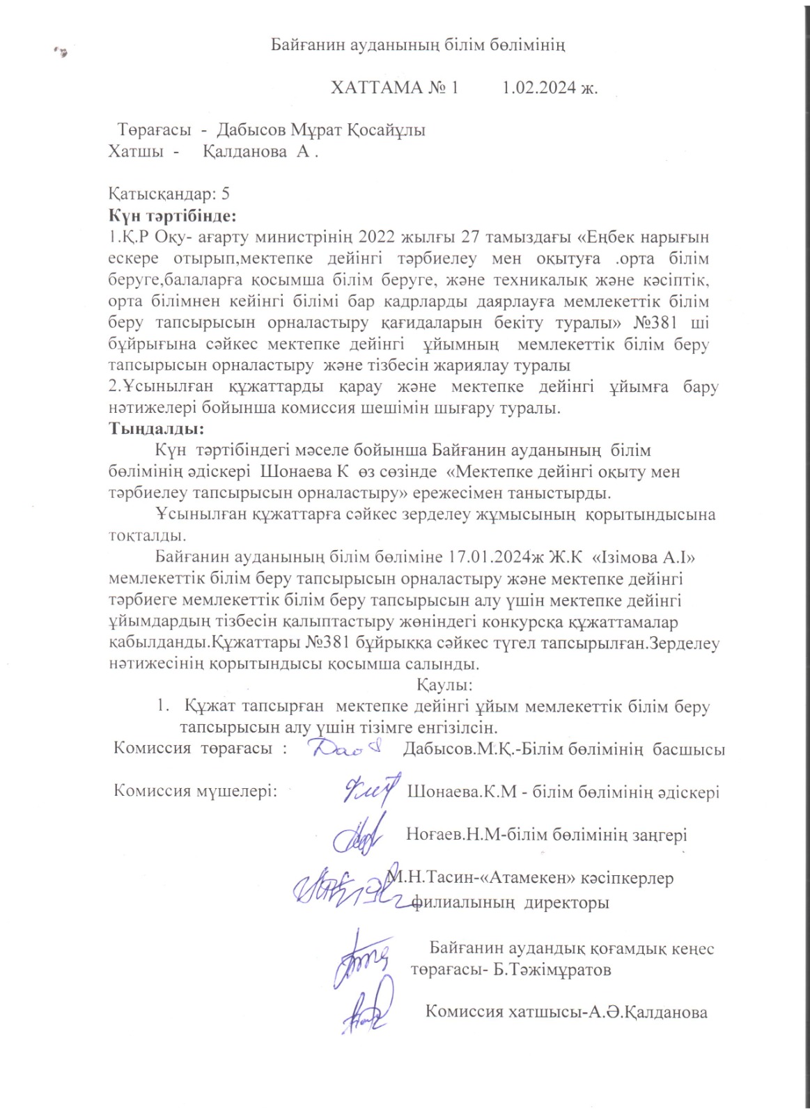 Комиссия төрағасы : М.Дабысов -Білім бөлімінің басшысы