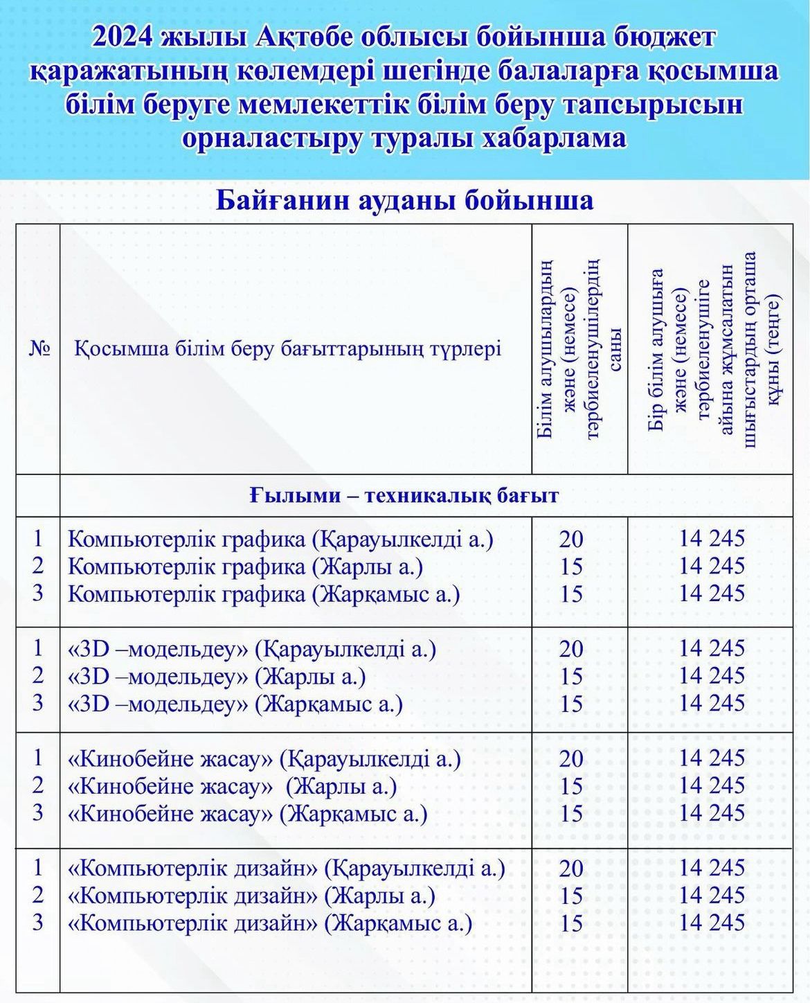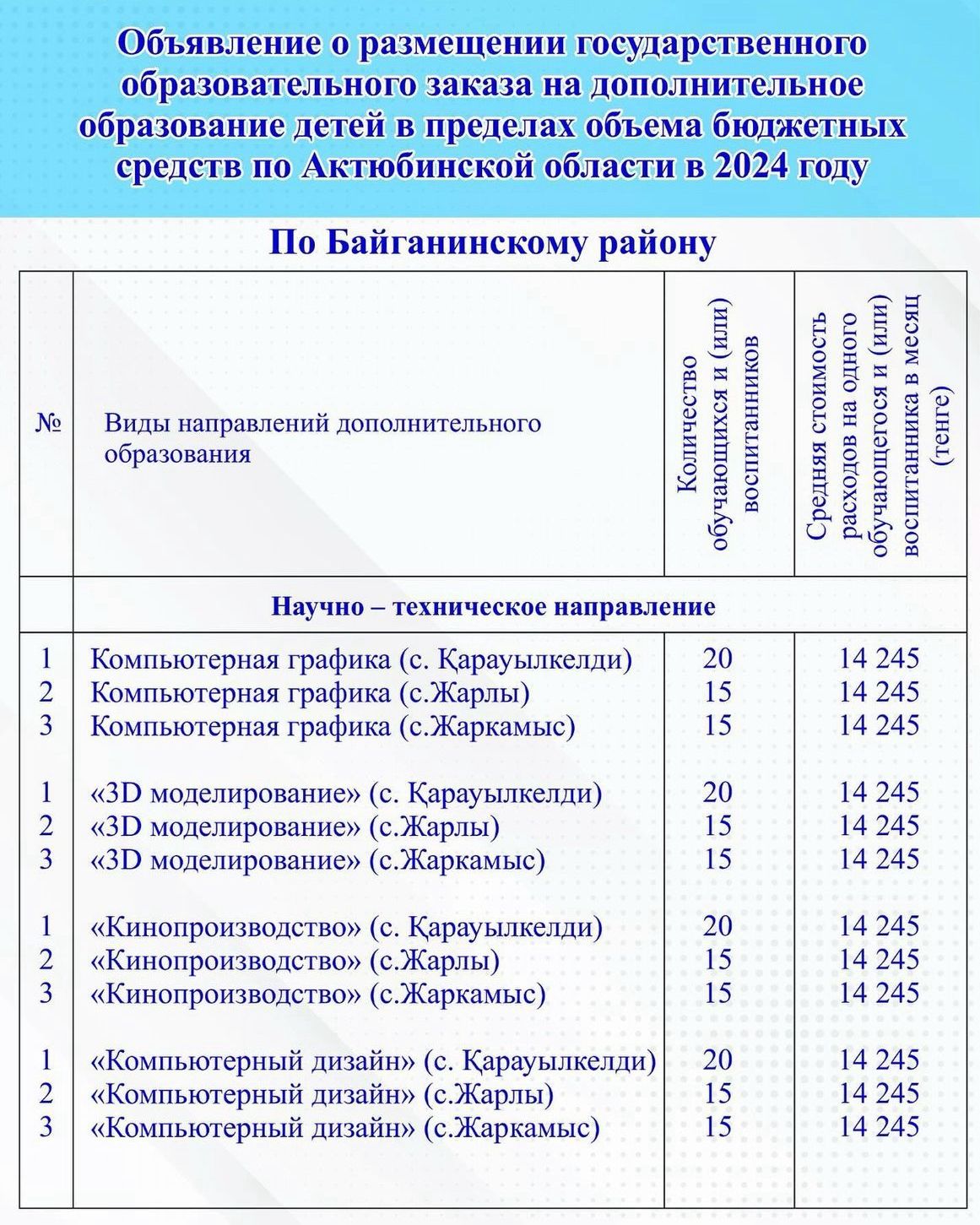 2024 жылдың 3-9 қаңтар аралығында балаларға қосымша білім беру бағдарламаларын іске асыратын ұйымдардан мемлекеттік білім беру тапсырысын орналастыруға өтініштер https://darabala.kz платформасында қабылданады.