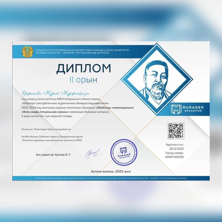 Ақтөбе облыстық ғылыми-тәжірибелік орталығының ұйымдастыруымен балалар жазушысы С.Я. Маршактың 135 жылдығына орай өткен "Пусть добрым будет ум у вас, а сердце умным будет" атты облыстық байқауында "Читаем строчки Маршака" номинациясы бойынша