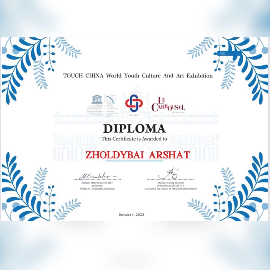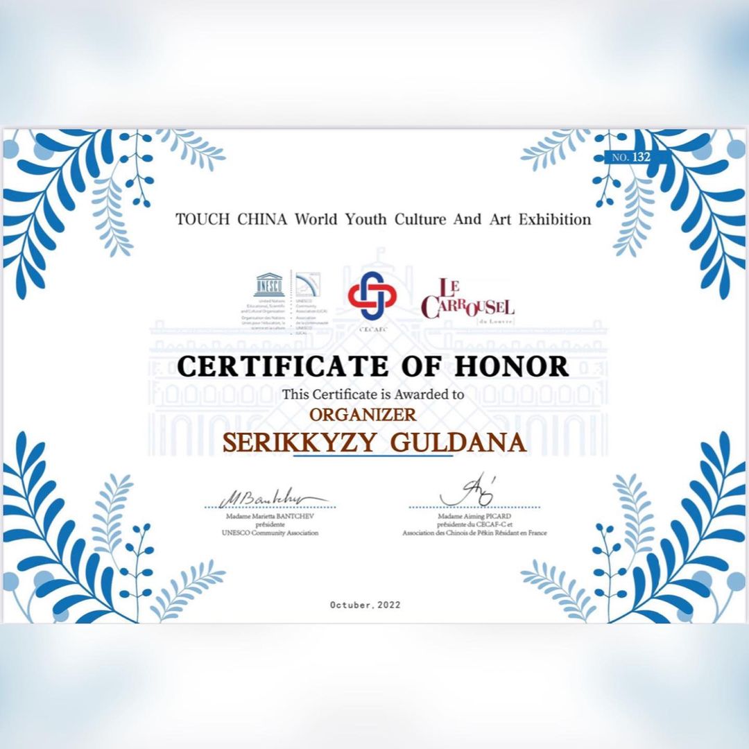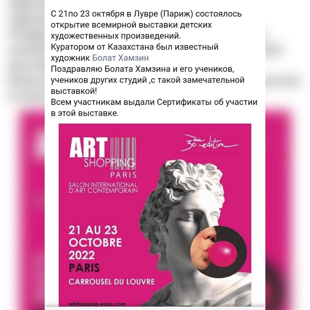Қазақстан Суретшілер Одағының мүшесі, кескіндемеші,атақты суретші Қазақстан балалар көрмесінің кураторы Болат Хамзин жетекшілік еткен, балалар шығармашылығын шетелдерде насихаттау мақсатында, әлемдік деңгейде өткен, Париждегі Лувр музейінде «Бүкіл әлемде – бейбітшілік» ұранымен «Ұлы Жібек жолы» көшпелі көрмесінде Орталығымыздың "Дизайн" үйірмесінің жетекшісі ГҮЛДАНА СЕРІКҚЫЗЫМЕН үйірме мүшелері: